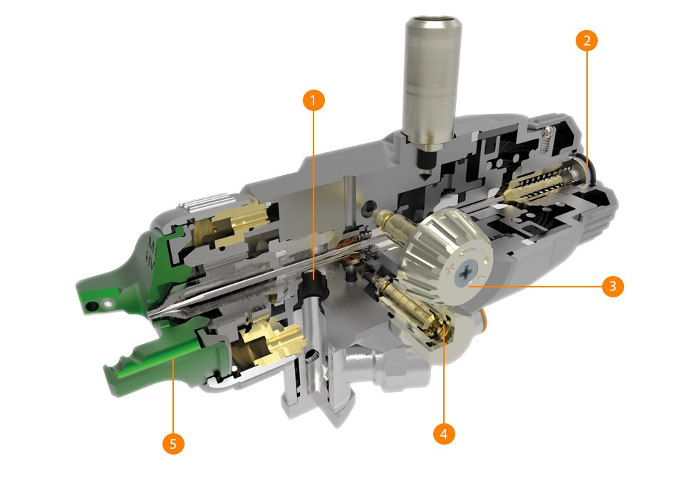 4) El regulador de control del abanico permite una distribución perfecta del patrón de pulverizado independientemente de la viscosidad del producto.
